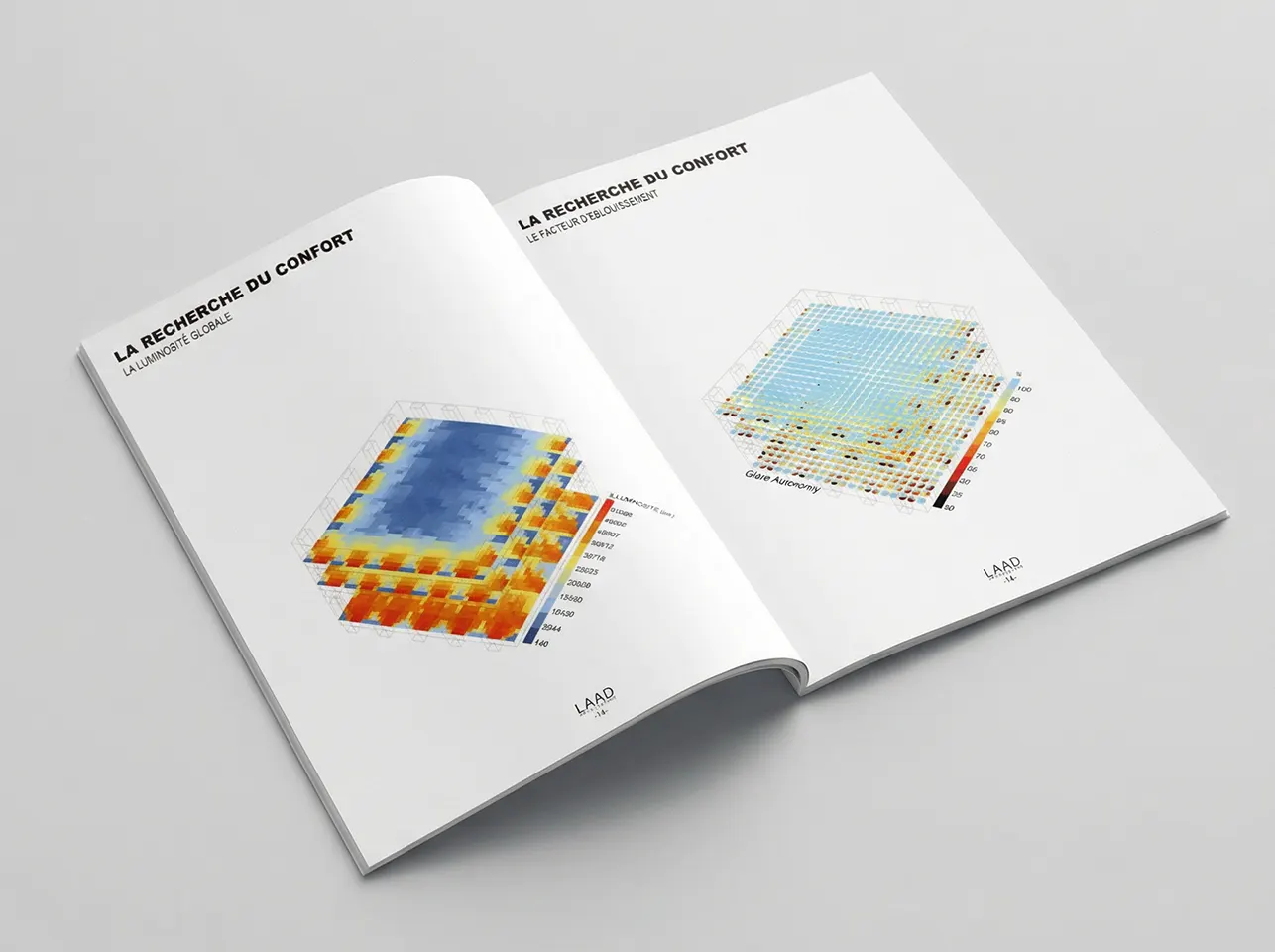 Pour “mettre en calcul” ces principes, LAAD ARCHITECTUREpropose une boîte à outils d’études et de simulations à activer au bon moment, sans tout faire systématiquement. Très en amont, des métriques rapides aident à cadrer (par exemple une règle de premier dimensionnement de vitrage type“10%-rule”, ou des analyses d’ensoleillement direct). En ESQ/APS, des simulations de lumière naturelle (Urban Daylight, accès au ciel, facteur de lumière), de vent (zones d’accélération, potentiel de ventilation traversante),de rayonnement et d’ombres extérieures permettent de sécuriser l’implantation et la volumétrie. En APS/APD, des indicateurs “en usage” (SDA, risque annuel de surchauffe, radiation façade) guident le dessin des baies, des protections, de la profondeur de plateau et des stratégies d’été. En APD/PRO, on affine avec l’éblouissement (glare), le dimensionnement précis de l’ombrage (solar shading), et les arbitrages finaux. Le document mentionne aussi l’ACV comme outil de variantes, depuis l’esquisse jusqu’au design détaillé, pour relier architecture, matériaux et impact.
