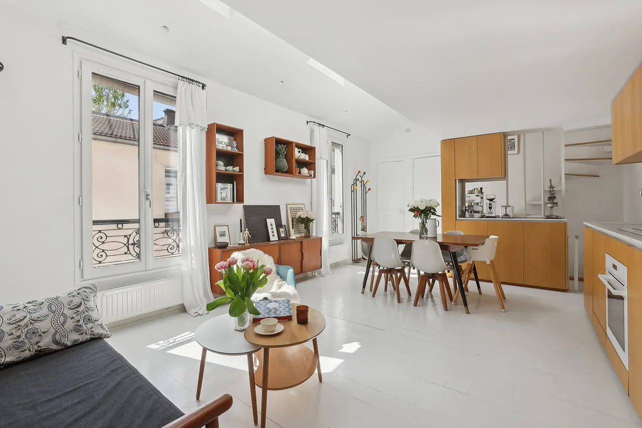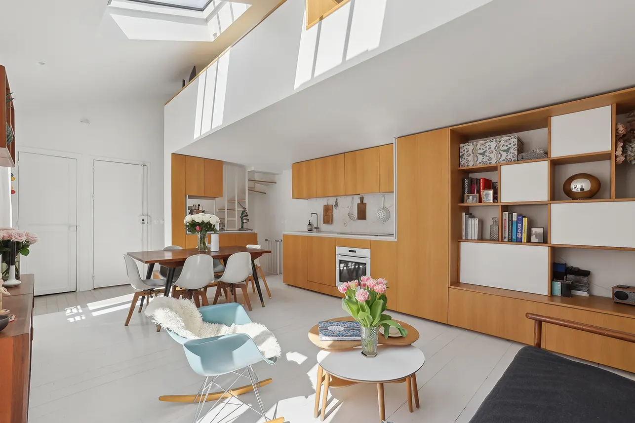 L’intervention réhabilite la structure existante et recompose les niveaux pour créer un grand séjour traversant en double hauteur, largement éclairé par des verrières et des fenêtres sur cour. Les agencements sur mesure – cuisine, rangements, escalier, mobilier intégré – optimisent chaque recoin et structurent les usages.