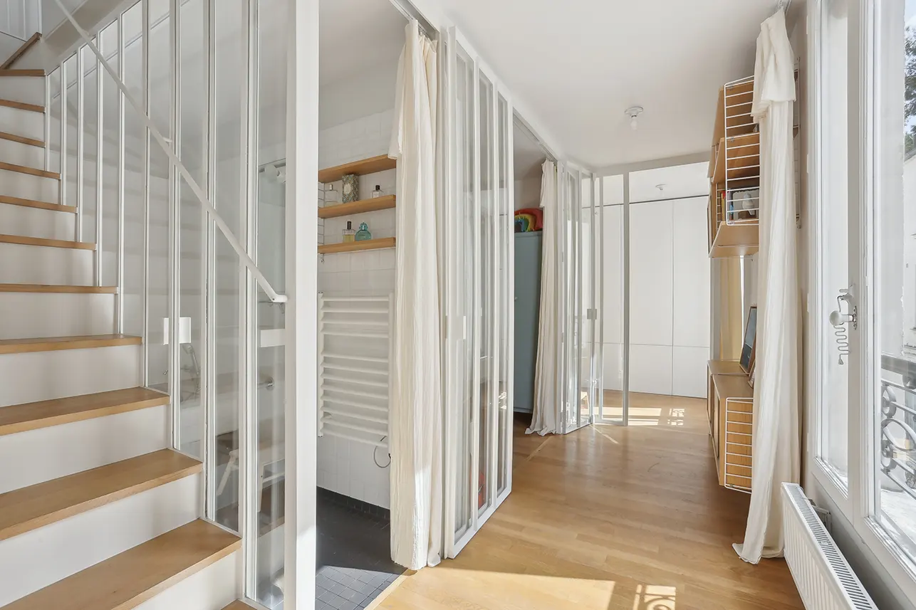Au cœur d’une cour pavée du 20ᵉ arrondissement, le projet transforme un petit logement sur cour en triplex familial de 65 m², dans un contexte patrimonial en zone ABF et en copropriété.