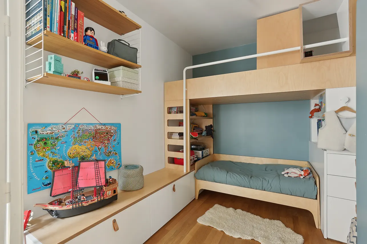 La conception bioclimatique privilégie l’inertie dans les espaces de nuit, l’usage d’isolants biosourcés et la protection de la fraîcheur estivale, tout en valorisant les matériaux nobles : parquet massif, marbre, menuiseries en bois clair. Le résultat est un appartement compact mais généreux en lumière et en qualité d’usage.