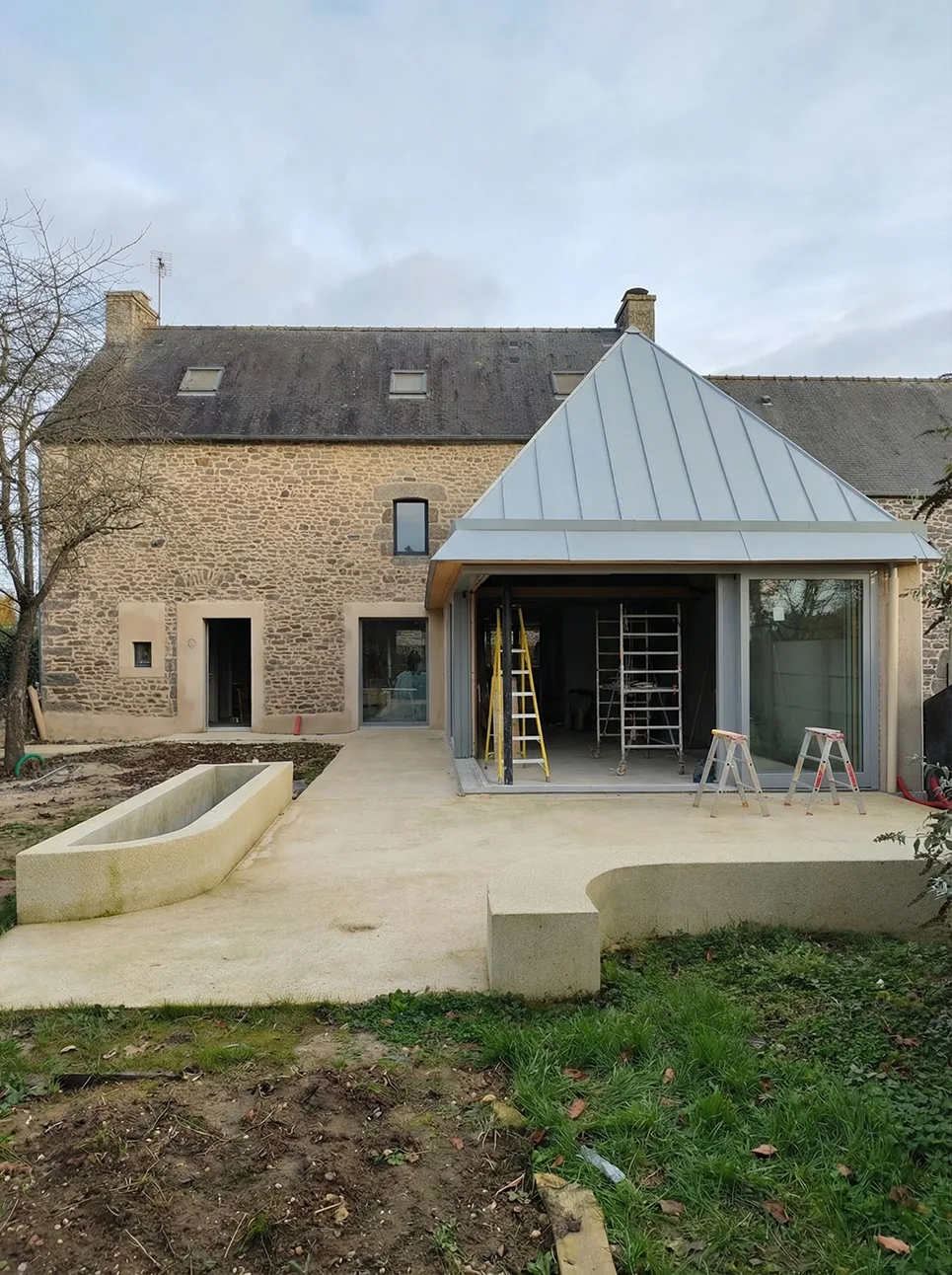 En bord de Rance, à La Vicomté-sur-Rance, le projet #VICOMTE réhabilite une maison en pierre et la prolonge par une extension contemporaine ouverte sur le jardin.