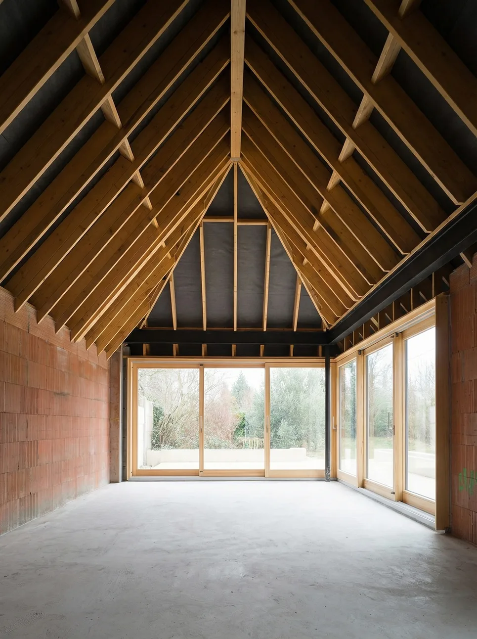 La salle à manger, en double hauteur, met en scène la charpente et capte la lumière. La cheminée existante est valorisée par un banc en béton coulé, et des agencements sur mesure structurent les usages et rangements. La démarche bas carbone privilégie la réutilisation de la structure, des matériaux biosourcés (isolant en coton recyclé) et une enveloppe performante. Un plafond rayonnant pilotable à distance garantit un confort stable, été comme hiver.