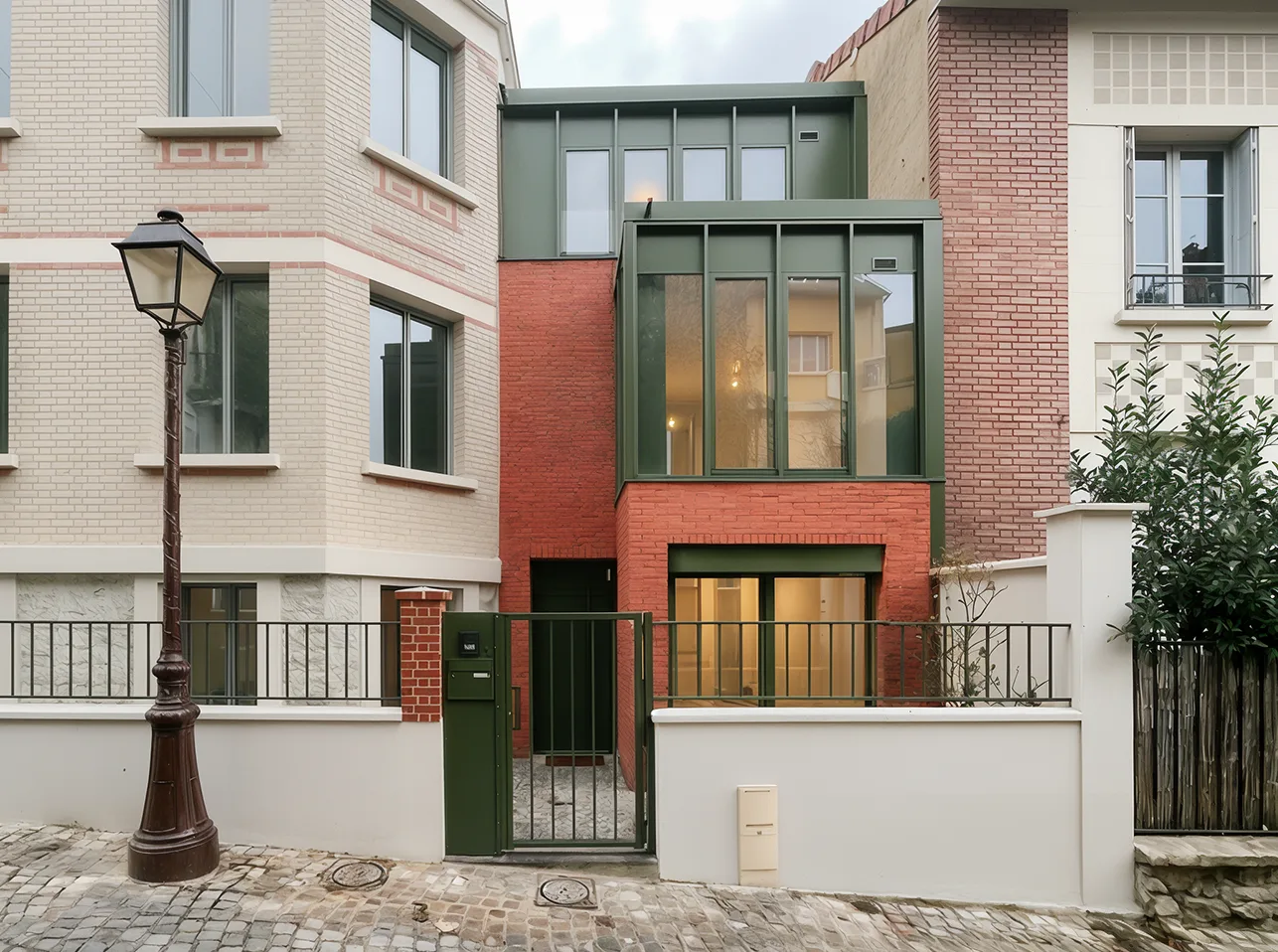 Menée en co-réalisation avec l’agence PUBLIC ARCHITECTES, l’opération crée cinq logements collectifs et une maison de ville sur une parcelle en forte pente et un gabarit urbain contraint, dans un tissu de « campagne à Paris » suivi par les ABF.